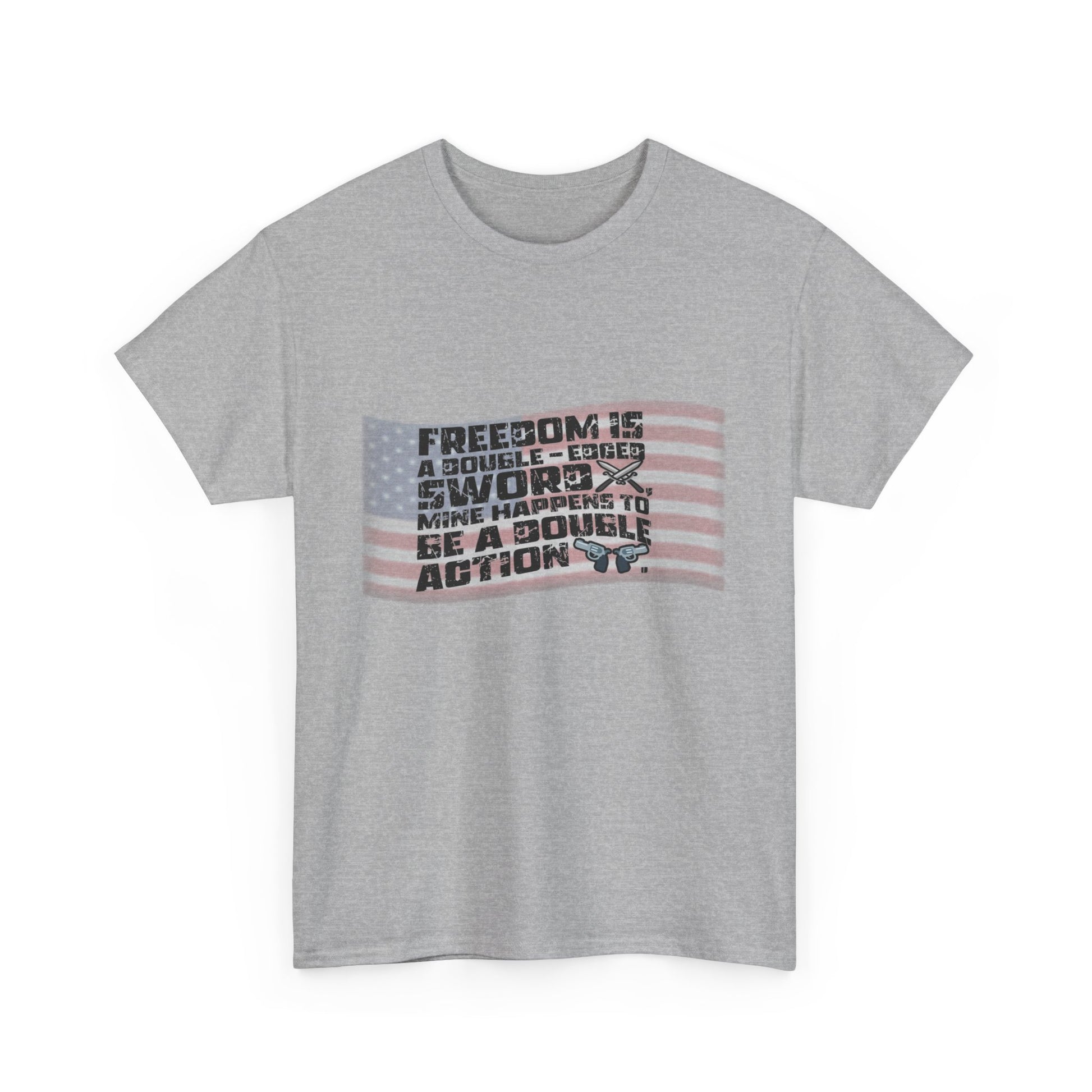 Make a bold statement with this unapologetically American design. Featuring the phrase "Freedom is a double-edged sword, mine happens to be a double action," this shirt blends grit, patriotism, and attitude.